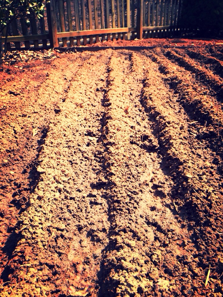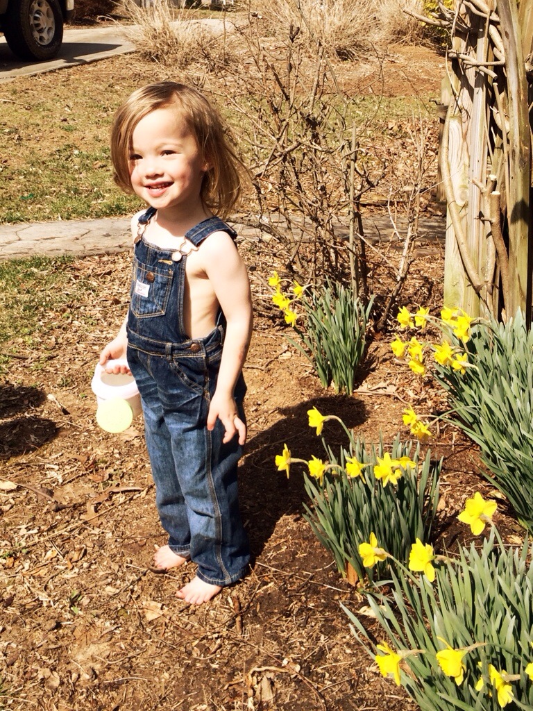 STEP ONE: Yippee! Thanks previous homeowners who built this garden! And because my blogging skills are awesome I have no before and after pics of the space right now. But I do have a cute picture of Happy watering the daffodils last weekend! The garden is off to the right of the picture. Then it iced here 3 days later. Not sure if those flowers are still alive. Let’s just use our imagination that I do have a designated garden space.