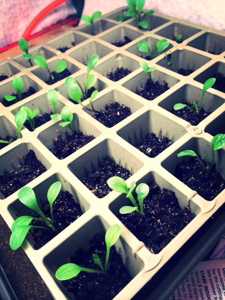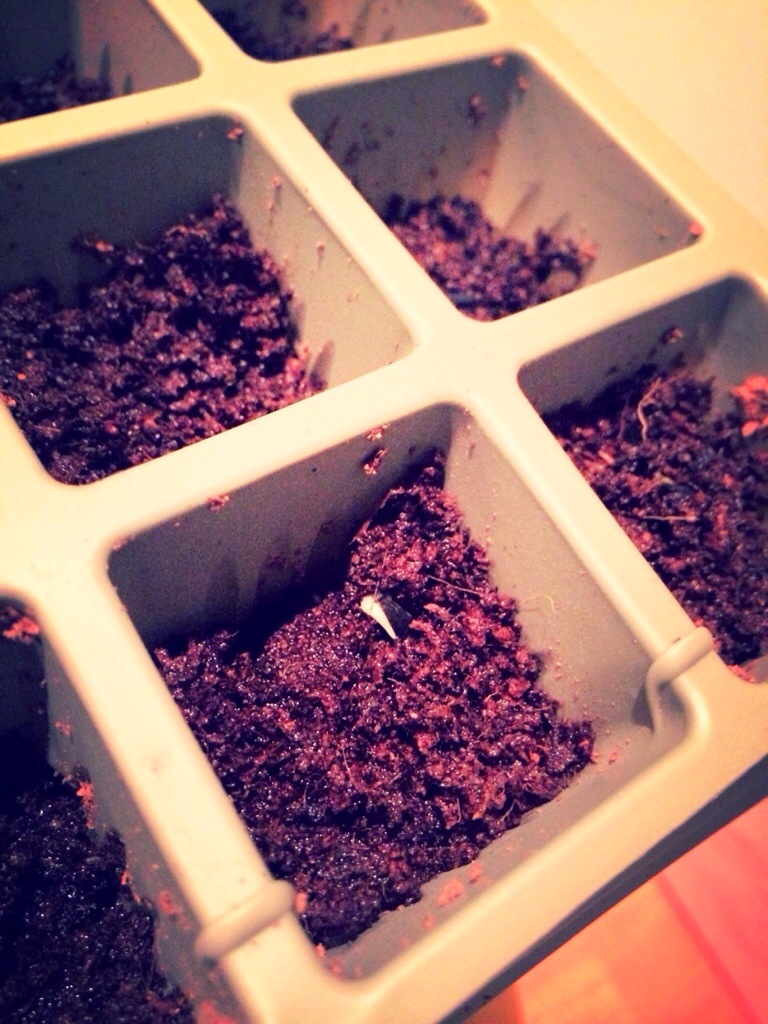 I checked and misted them every day in between planting the next tray and on day 3, we got our first little sign of germination! Yay! I have a green thumb!
