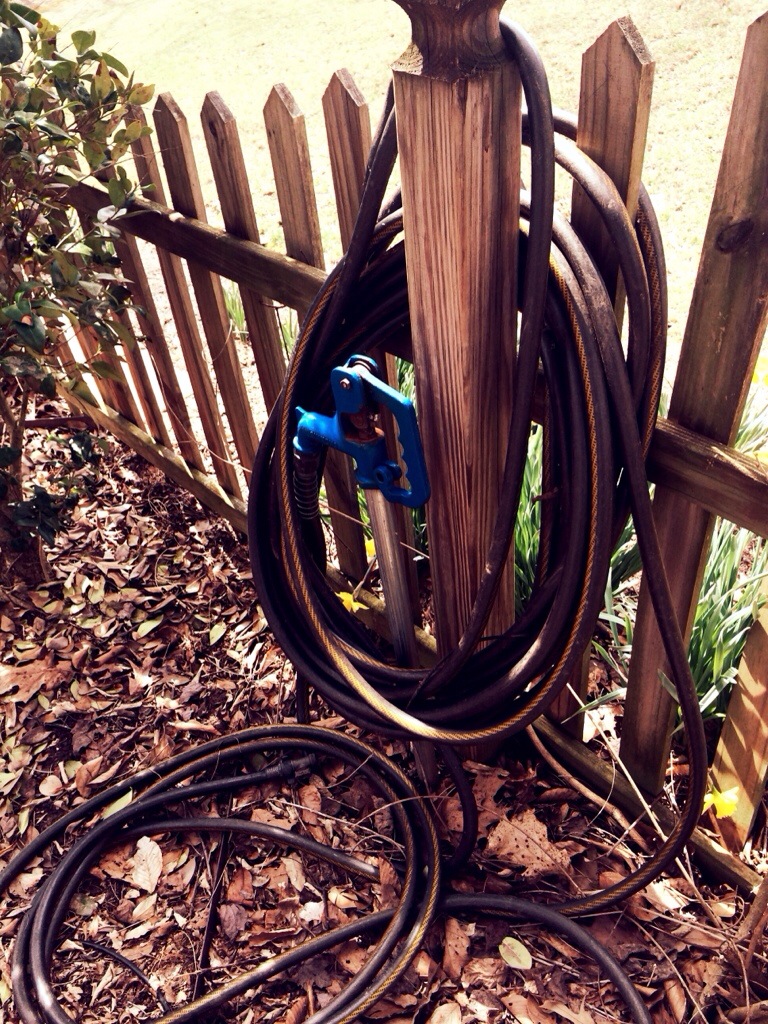 One of the things we loved about our house when we bought it last April is that it has a fantastic garden. It’s about 30×30 and fenced in with a little picket fence. There is an arbor over the entrance that has vines with pretty flowers that welcome you in almost like a secret garden. In the middle of the big square is a fountain. There are paths made of stamped concrete that make an X into the four corners. It’s amazing. In theory.