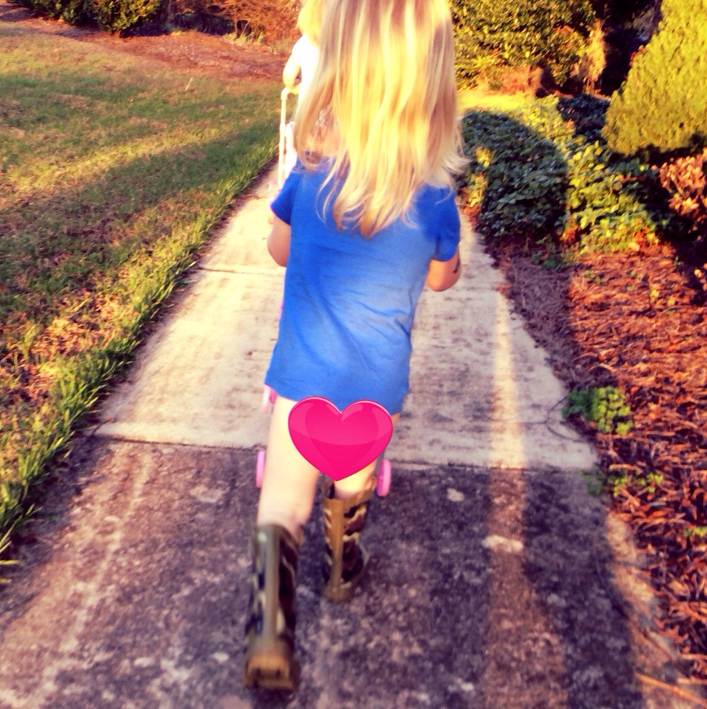 What happens when your child wants to pee in the grass? You say, “Sure sweetheart!”. When her sister tries to copy her and you aren’t looking, you get pee pee pants. When it’s 70* and you are outside playing and your replacement pants are 2 flights of stairs away, we just take off the pee pee pants and carry on about our business. Her business last night was pushing her baby doll stroller around the house in her rainboots.